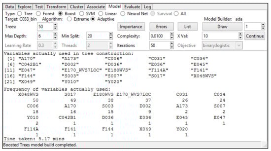 Then, following the steps described in the schematic representation at the end of this paper (Figure A1, Appendix A), the .csv dataset was loaded in the Rattle (https://rattle.togaware.com (accessed on 24 August 2022)) (version 5.4.0) interface of R, and the Adaptive Boosting technique for decision tree classifiers [] as the 1st round data mining was applied with default settings (Trees:50, Max Depth:6, Min Split:20, Complexity:0.01, Learning Rate:0.3, Threads:2, Iterations:50, and Objective:binary logistic). The purpose of the 1st selection stage was to discover the most important variables related to the one being analyzed (see Figure 1) in its binary form. It was performed on a Windows Server Datacenter virtual machine, configured with a maximum of 32 Intel Xeon Gold 6240 Cascadelake CPU logical cores (from all 36 available–18 physical cores) and 32 gigabytes of RAM, in a private cloud (https://cloud.raas.uaic.ro (accessed on 24 August 2022)) managed using OpenStack on Ubuntu. The reason why the boost plugin in Stata was not used is related to its time-consuming execution and limited capabilities in terms of automatic variable selection and treatment of missing values [].