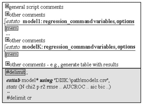 The first two steps (Figure 2), including the regression command and invocation of the MEM one, must be repeated for each particular model to export. The last one (esttab) finally collects (bottom of Figure 2) both default and custom statistics to assess model performance (between the parentheses corresponding to the stats keyword). The custom ones (e.g., AUC-ROC) are those computed and/or collected using MEM (see the Listing A2 in Appendix A).
