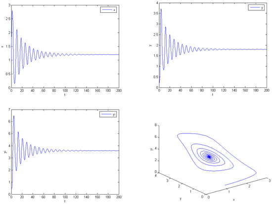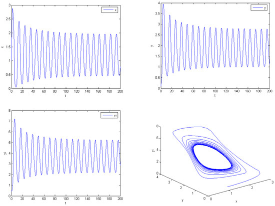 (ii) By calculation, we obtain By Theorem 5.1, a Hopf bifurcation occurs when . Select . From Figure 2, we can find that both the predator and prey populations reach periodic oscillations around the equilibrium in finite time;