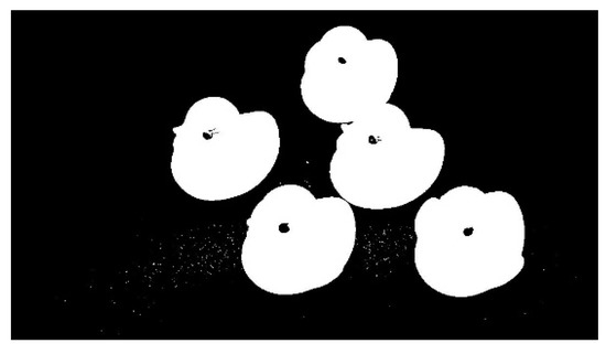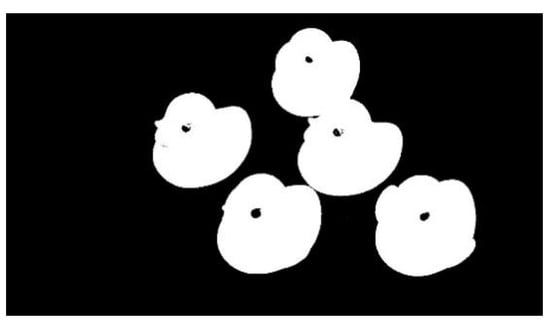 Firstly, binarization is performed on the gray image M and , respectively, to obtain the binary images , , as shown in Figure 7 and Figure 8 below.