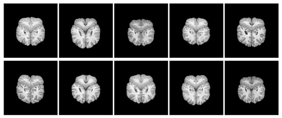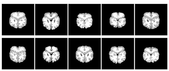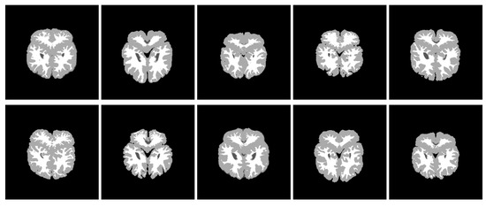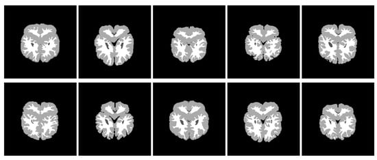 In this section, we show the performance of thresholding segmentation with the convex combination of pseudo grouping functions and the convex combination of grouping functions on 10 T1 weighted MRI images (see Figure 11). The MR cerebrum information as well as hand-operated segmentations originated from the morphometric analysis center of Massachusetts General Hospital. We evaluated the quality of excision by comparing with the ideal manually segmented images obtained on the same web page (see Figure 12). The purpose of this image segmentation was to divide each pixel in the cerebrum into two kinds—gray matter and white matter. In fact, it is a part of brain region volume analysis, which plays a great role in assessing the development of illness, for instance, Alzheimer’s disease, epilepsy or schizophrenia ([39,40]).