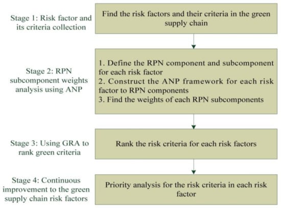The multi-criteria decision-making model (MCDM) is a powerful tool to prioritize the limited alternatives based on selected criteria. In this study, we have taken advantage of the MCDM models to evaluate risk assessment using failure mode and effect analysis (FMEA) [], Analytical Network Process (ANP) [], and the Grey Relational Method (GRA) []. In this section, we explain our proposed framework. Based on the literature review, we understood that risk analysis in the green supply chain is as important as in the traditional supply chain. Therefore, we first defined the main risk factors from the literature review and then used a focus group to interview a few senior managers and engineers to define the risk criteria for each risk factor. Second, we used ANP to derive the weight of the RPN subcomponent in each component. Third, using the weights of each RPN subcomponent which supported the functionality of risk criteria, we evaluated the order of risk criteria in each risk factor using GRA. Finally, we established the priority of green risk criteria for each risk factor for continuous improvement in green supply chain management. The framework for finding the risk criteria in each risk factor has been elaborated in Figure 1.