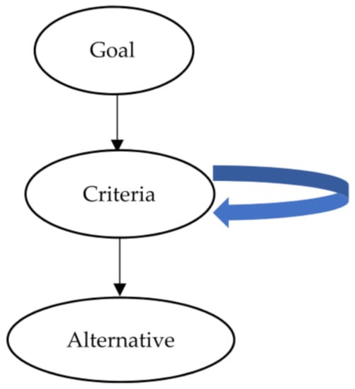 Saaty [] expressed the hierarchy and network structures as an ANP method to capture different aspects of tacit knowledge. Elements were grouped into clusters of related factors rather than hierarchical levels. Links were made from a parent factor in a cluster to several elements, and then efforts were made to overcome the disadvantage of traditional AHP [,]. The framework of the ANP is shown in Figure 2.
