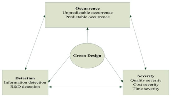 In the next step, the RPN is obtained from the product of these three parameters in order to measure the risk and severity of a failure mode. Hence, we can evaluate the three components of FMEA according to different natures of the green supply chain and can define four subcomponents: quality severity, time severity, elasticity severity, and cost severity. In addition, the degree of occurrence and difficulty of detection can also be expanded in different directions.