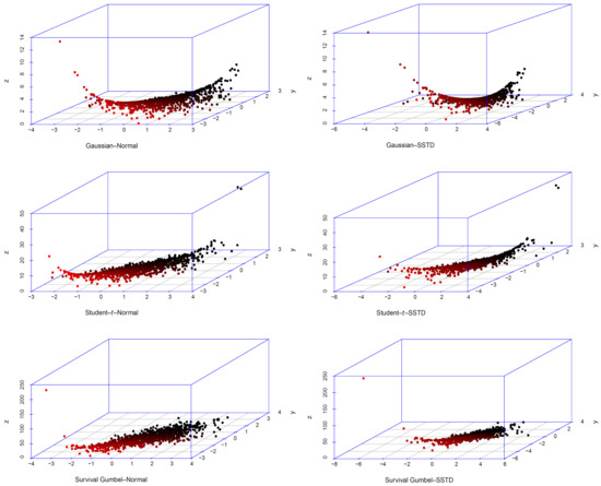 Traditionally, econometric models for financial risk research typically assume a multivariate normal distribution with a linear dependency structure to describe the correlation between asset returns, such as the DCC–GARCH. However, numerous empirical studies have shown that skewed, kurtosis, fat-tail, and nonlinear joint distributions are more realistic for real-world circumstances [37,38,39]. We randomly simulated data from different Copula families with different marginal distributions to compare the traditional ones (see Figure 1). Comparing the two columns, we can see that the marginal distribution of the skewed Student-t (SSTD) can capture some more extreme data. In contrast, looking at the rows, one can observe that survival Gumbel and survival BB8 captured lower tail correlation well, survival BB1 performed well on upper tail, and Student-t measured both upper and lower tail correlation symmetrically. Although only part of the simulation was shown in our research, we were able to draw an inference that many different copula families and marginal distributions are suitable for fitting correlation under different circumstances. Therefore, we need many marginal distributions and copula families to ensure that the target joint can be optimally fitted.