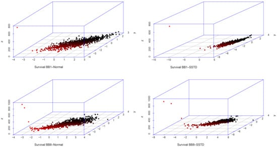 In the context of studying dependency structure, Kendall’s is a measure of rank correlation reflecting monotonic dependency [43]. If margins are normal distributions, parameters in the Gaussian copula and Student-t copula usually represent the Pearson linear correlation coefficient . In contrast, Kendall’s is used to reflect a nonlinear dependence in Archimedean copulas. In addition, the Gaussian copula is symmetric and without tail dependence. The t-copula is symmetric, but the tail dependence can be measured. The survival Gumbel copula, the survival BB1 copula, and the survival BB8 copula are asymmetric with an upper tail, a lower tail, or both.