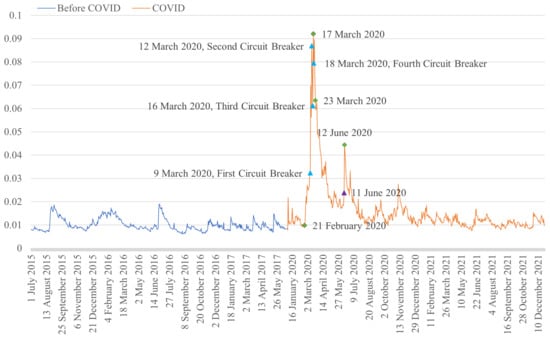 The target research period of the daily data was from 5 January 2010 to 30 December 2021 with two scenarios of pre-COVID-19 and during COVID-19; see Table 2. Pre-COVID-19 covers the period from 5 January 2010 to 30 June 2017 with 1886 observations. The in-sample period was from 5 January 2010 to 30 June 2015 with 1381 observations, and the out-of-sample period was from 1 July 2015 to 30 June 2017 with 505 observations. Scenario during COVID-19 imposed comparative data from 1 July 2017 to 30 December 2021 with 1133 observations. The in-sample period was from 1 July 2017 to 31 December 2019 with 629 observations, and the projected period was from 2 January 2020 to 30 December 2021 with 504 observations. Typically, regulators are more interested in the overall risk contribution over a specific time period rather than for a specific date, so each two-year forecast period before and after the outbreak is divided into four periods for comparison.