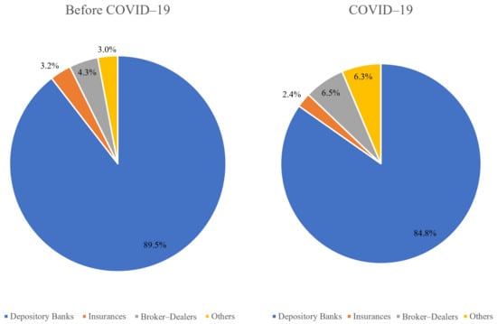Depositories contributed the greatest systemic risk to US financial industry of the four financial categories. However, they were the least vulnerable group to financial market risks. Instead, Broker–Dealers were the most vulnerable group when faced with an enormous financial risk shock. While the risk of the financial markets increases, the share of Depositories in the risk contribution shrinks, as do the insurance companies. In contrast, the share of systemic risk from broker–dealers and other financial institutions increased during COVID-19.
