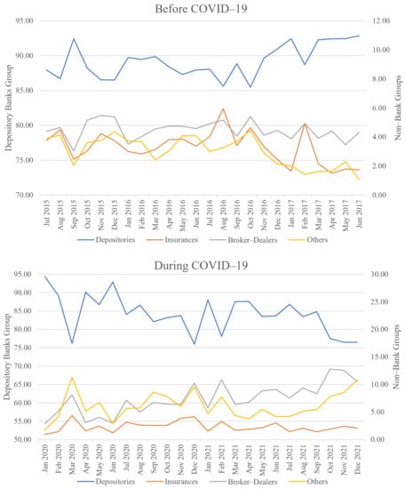 We selected a few financial companies from the SP500 companies to represent the US financial market. The data retrieval process consisted of three steps. First, 60 financial institution tickers were retrieved from the SP500 and data validity was checked to get the daily stock price. This is because Yahoo Finance provided an adjusted stock price, meaning that along with the price it remains a fixed outstanding and market capital change. It is easy to prove that all 60 companies have a market cap of over USD 5 billion as of 26 September 2017. Second, the 60 financial institutions were divided into four groups according to the Standard Industrial Classification (SIC) [16]. The four classifications are Depositories, Insurances, Broker–Dealers, and Others (refer to abbreviations). Third, based on the companies listed by Banulescu and Dumitrescu [3], a new approach was taken to target the financial companies, as some of them had closed or had provided incomplete information. All financial companies from SP500, with a total of 68 companies (to search date 27 August 2017), were selected, and 60 companies were confirmed for the final target list based on data completeness and availability (see Table 1 for pre-COVID-19 period). However, the number of target companies shrank to 55 companies during the COVID-19 period for a similar reason. (According to the US Standard Industrial Classification (SIC) code, the 60 firms have been classified into four groups in terms of depositories banks (SIC code 60), insurance companies (SIC code 63, 64), brokers–dealers (SIC code 6211), and other financial institutions (SIC code 61, 62, excluding 6211). The companies have been categorized in the Table 1 according to the new standard.)