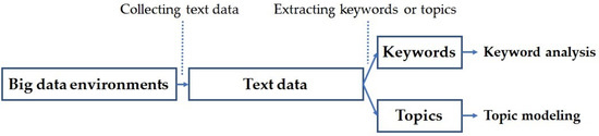 In big data environments, there are huge amounts of data consisting of diverse data types, such as web pages, texts on social network services, sensing data on the internet of things, articles, papers, and patent documents. So, we can collect text data from various big data resources. From the collected text data, we extract keywords or topics for keyword analysis or topic modeling, respectively. Next, we apply the results by text data analysis to many applications.