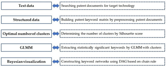 represents and are the parent nodes of . Additionally, each keyword, , is conditionally independent of other non-descendants. So, we carried out Bayesian visualization using DAG networks based on Equation (15). Figure 4 shows the procedures of our proposed methods.