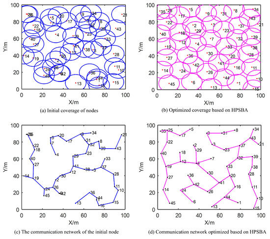 - HPSBA based node optimization coverage: Each target node runs the proposed HPSBA to become a deployed node. Parameters that are considered for coverage are set as follows: initial value of inertial weight = 0.9, probability switch weight , cognitive and social scaling parameters and .