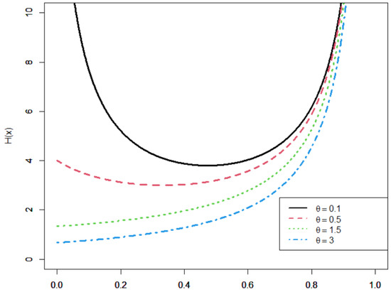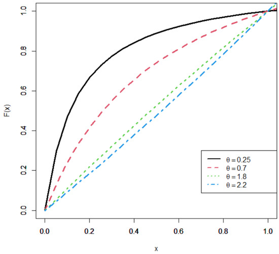 The stochastic order arises when we have two independent continuous random variables, , such that ; we say that is stochastically smaller than , if is a non-decreasing function of x. For more details see ([22,27,28]).