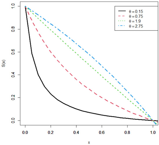 According to [24,25], the reliability, R, of a component arises when its strength is greater than its stress. Let represent the strength of the component and represent its stress. It is said that the component is functioning when the condition is held and then its reliability is given by