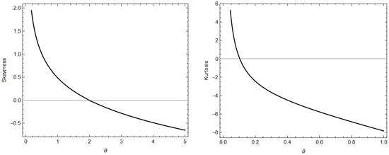 Moreover, Figure 6 shows the skewness and the kurtosis plots and it is clear that the skewness is positive when and negative otherwise and the kurtosis is positive when and negative otherwise.