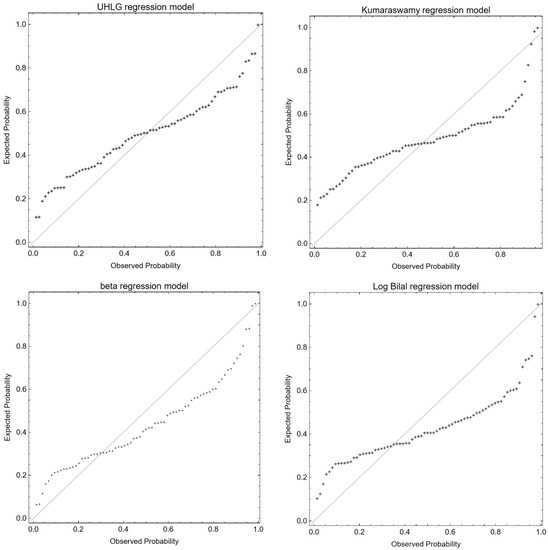 Figure 7 shows the PP plots of the theoretical and empirical probabilities of the Cox–Snell residuals for different regression models fitting the risk survey data.