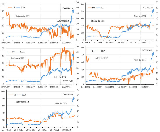 It now has become a global consensus to reduce greenhouse gas emissions and actively respond to climate change. As an energy consumption, carbon emissions are closely related to the economic development of countries [1]. Following the rapid growth of the national economies and the acceleration of globalization, the huge demand for energy consumption in the world has led to the emission of large amounts of greenhouse gases and caused abnormal climate and ecological changes [2]. To combat climate change at low cost, carbon trading is gradually becoming an effective market instrument to control greenhouse gas emissions [3,4,5]. With the entry into force of the “Kyoto Protocol”, carbon emission rights have become an international commodity, which undoubtedly has a huge driving effect on the global carbon trading market. The EUA is the first carbon emissions trading market established worldwide, and as the world’s largest carbon trading market by the end of 2017, it is closely related to global carbon emission reduction. As the world’s largest developing country and the world’s second largest emitter of greenhouse gases, China has also actively responded to the call for global greenhouse gas emission reduction. Since the Kyoto Protocol came into force in 2005, China has actively participated in international carbon emissions trading, providing support to the global goal of achieving low-carbon economic development [6]. Subsequently, China established eight carbon emissions trading pilots in 2013, including Beijing, Shanghai, Guangdong and Shenzhen, and commenced the construction of a national carbon emissions trading scheme (ETS) at the end of 2017, to achieve an effective docking between different carbon trading markets. At the same time, the launch of the national ETS means that China’s carbon market is becoming the largest carbon market in the world. Since the launch of the carbon pilots, the carbon trading scheme in China has been continuously improved and the national carbon market is actively converging with the international carbon market. However, the carbon price has experienced large fluctuations in the course of operation and there are still significant risks in the operation of the market. Meanwhile, the sudden outbreak and spread of the novel coronavirus (COVID-19) in 2020 had a severe impact on financial markets across the world, leading to dramatic fluctuations in global financial markets [7,8]. In order to prevent the spread of COVID-19, many countries have adopted lockdown rules, during which the greenhouse gases contributing to global warming have continued to decrease [9]. Therefore, the dependence structure between important international carbon markets may change.