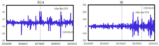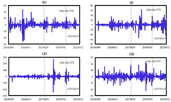 In the GARCH model, is the effect of the external environment on the carbon price returns of the market and represents the effect of carbon price return fluctuations on its own market [58]. For both before and after the launch of the national ETS, the GARCH coefficient is significant at the significance level of 1%, suggesting that the fluctuations of carbon returns in the current period in each carbon market is positively influenced by the fluctuations of the previous period. With the estimation of the ARMA(1, 1)-GARCH(1, 1)-t model, is greater than in most cases before the launch of the national ETS, or the difference is smaller, suggesting that more internal factors of the carbon market have a greater impact on the fluctuations of carbon returns than the external environment. After the launch of the national ETS, is much larger than in Shanghai and Guangdong, where carbon return fluctuations in this market are more influenced by the external environment, which is more evident after the onset of COVID-19. It can be observed that is much larger than in the EU at any stage, reaching a maximum of 0.999, which suggests that 99.9% of the fluctuations in the current period carry over to the next period, respectively, and that fluctuations have a long-term memory. When there are large fluctuations in the various carbon markets, it is possible to analyse whether the fluctuations are due to own factors or the influence of the external environment.