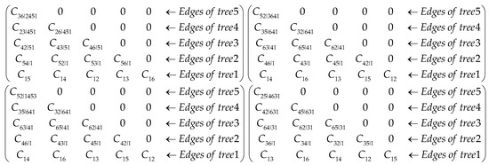 For a copula density function with an n-dimensional random variable, it can be factored into the product of pair copula density functions. In particular, a n-dimensional vine structure can be represented by trees, i.e., tree , tree has nodes and edges, each of which corresponds to a pair copula function. Figure 1 illustrates the four-dimensional structural decomposition of the C-vine copula, so based on Equation (7), the C-vine copula density function of Figure 1 can be factored out as follows.