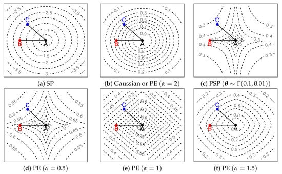 Contours of different kernels. (a) Negative Euclidean distance kernel in support points (SP) method; (b) Gaussian kernel; (c) sparsity-inducing kernel in projected support points (PSP) method; (d–f) power exponential (PE) kernel with , respectively. The point A and point B in all figures have the same coordinates in the second dimension, and .