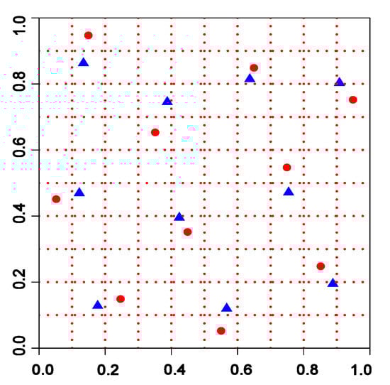 From Figure 2, rep-points (●) based on kernel is indeed a central Latin hypercube design, which has great one-dimensional projection. Observing carefully, these circular points can be observed as the result of moving the triangular points to the center of the grid while keeping the rank of the triangular points in each dimension unchanged. This rank-preserving sampling technique is known as Latin hypercube sampling with dependence in [,,].