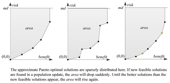 Third, this article designs a comprehensive evaluation indicator, area. The area can evaluate the convergence and one-sided spread of the sets solved by multi-objective optimization algorithms. It mainly contributes to the evaluation of the convergence speed of the multi-objective optimization algorithms.