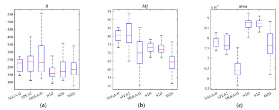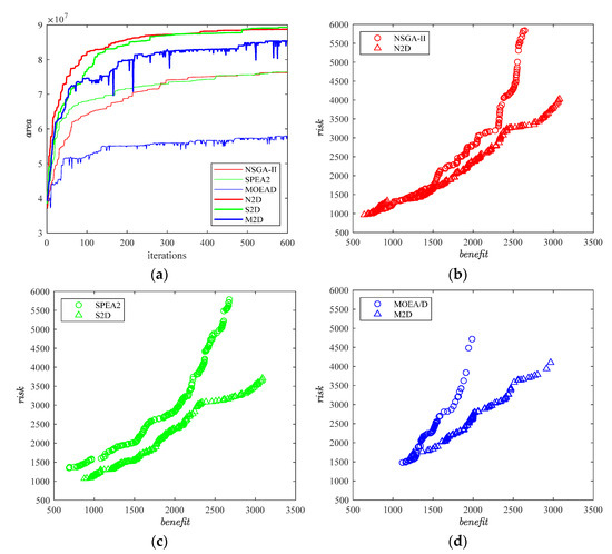 - The distribution of the solution sets can be seen from Figure 5b–d. NSGA-II was not much different from SPEA2, but both were better than MOEA/D. N2D was not much different from S2D, but both were better than M2D. N2D, S2D and M2D were better than NSGA-II, SPEA2 and MOEA/D.
