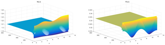 By direct computation, we have ( N * , P * ) ( 1.2130 , 0.3344 ) is the unique positive equilibrium, and A 0.8244 , B 2.0220 , C 0.1672 , D 0.3064 , B C A D 0.0854 > 0 , and a 0 0.3717 . Hence, hypothesis (11) holds. Now, we give the curves of a and d 1 d 2 a 0 with the predator’s diffusion coefficient d 2 (Figure 1). We can see that a 0 < a < a holds when d 2 < d 2 * , then the Turing instability of ( N * , P * ) may occur. When d 2 > d 2 * , then a > a holds, which implies ( N * , P * ) is locally asymptotically stable. Choose d 2 = 0.1 , we have a = 2.4603 , σ = 0.1723 , σ + = 2.4800 , and k { 2 , 3 , 4 , 5 , 6 } such that k 2 l 2 ( σ , σ + ) . Then ( N * , P * ) is Turing unstable (Figure 2).