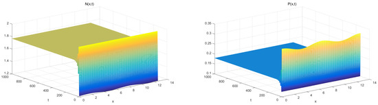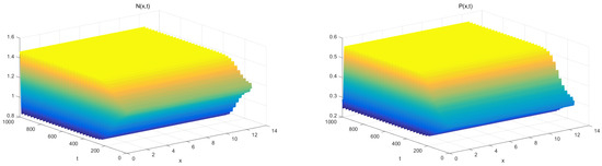 In order to verify the previous conclusion, we provide some numerical simulations by Matlab. In particular, the numerical simulation of the systems with τ = 0 is implemented by the pdepe function in Matlab, and τ > 0 is implemented by the finite-difference methods. Choose the following parameters.