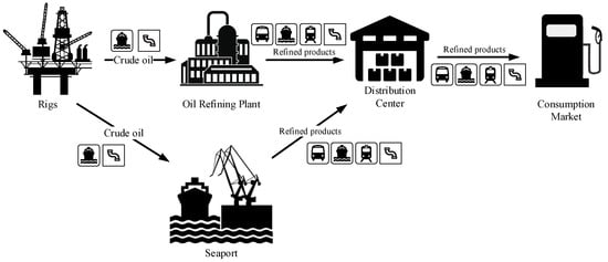 The oil and gas supply chain considered in this study includes upstream, midstream and downstream facilities, as shown in Figure 1. In the first tier of the supply chain, oil rigs are responsible for extracting and transporting crude oil. This amount of crude oil is either exported at ports or filtered into other products at the refineries. At the same time, these seaports are also responsible for importing refined oil products. The third tier of the supply chain is a system of distribution centers in different forms of regional centralized warehouses. The primary role of these distribution centers is to maintain inventory and perform crossdocking processes before shipping gasoline and diesel oil to retail stores in the fourth tier. The transport system between the tiers of the supply chain consists of four common modes for domestic oil and gas transport: roads, waterways, railways and pipelines.
