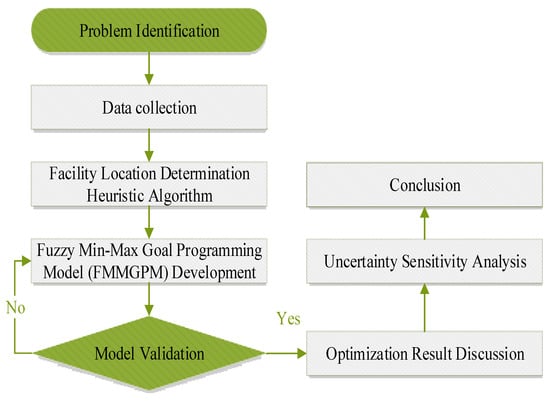First, the single-objective optimal solutions are determined. The objective function values from these single-objective solutions are aggregated and used as the goals ( of each related objective. In step two, constraints (43)–(45) are established to estimate the under-attainment ( and over-attainment ( deviation variables between the objective function values and the goal value.