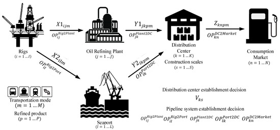 In addition to supporting initial investment decisions, the proposed model uses the binary variables , , , and to represent the decision to develop oil pipelines and the binary variable to describe the decision to build different scale distribution centers. Finally, the float variable is used as an intermediary to determine the supply chain’s demand response rate in consumer markets. The decision variables which mentioned above are presented Figure 4.