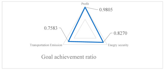 Next, to determine the solution for FMMGPM, the model is resolved with the addition of new constraints and objective functions, such as Equations (43)–(49). The weights of the objective functions related to profit, energy security and emissions are chosen equally to imply the balance of 3E for sustainable development. The values of the objective functions provided by the compromise solution are listed in Table 6. As shown in Figure 5, the results show that FMMGPM’s solution almost reaches the goal value at the objective functions that maximize profit and energy security while sacrificing little in minimizing emissions.