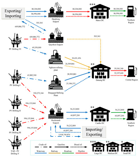 Based on the value of the decision variables in the solution of FMMGPM, the configuration of the petroleum supply chain, as well as the product flow for both crude oil, gasoline and diesel oil, is depicted in Figure 6. This configuration includes all components of the upstream, middle-stream and downstream petroleum supply chains across Vietnam.