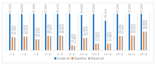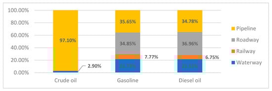 In general, the income of a petroleum supply chain depends mainly on crude oil exports. Meanwhile, approximately 69.7% of gasoline products and 73.9% of domestic diesel products are imported products. Owing to capacity limitations, post-refined products obtained from oil refineries are only sufficient to supply the central market. Therefore, other refinery projects that have been invested and developed by the government are expected to change to reduce the import rate. An overview of the transport infrastructure and supply chain configuration proposed by this optimization model using a combination of all modes of transport is considered, based on the advantages of each mode for each area’s infrastructure. According to the above configuration, the shared structure of transport modes used in the supply chain logistics system is shown in Figure 7. The chart presents the share of modes of transport for crude oil, gasoline and diesel. Because of the large transportation volume, the transportation of crude oil is primarily operated by pipelines (97.10%), and a negligible proportion by waterways (2.90%). For gasoline and diesel, the share of pipelines and waterways, which includes both inland waterways and coastal waterways, is approximately 34% to 36%. In addition, the trucking mode plays a key role in distributing gasoline and diesel from distribution centers to consumer markets that cover a large area, such as the north and south of Vietnam. Thus, trucking constitutes approximately one-fifth of the overall logistics system. Finally, with the lowest proportion (6.75–7.77%), the railway system shows its advantage in the long vertical and narrow horizontal areas, such as central Vietnam. In summary, the results of FMMGPM imply that the pipeline mode of transport, without infrastructure development in Vietnam, has the potential to have a positive impact, as well as a key role in the 3E sustainable development of Vietnam.