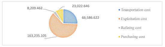 In addition, fixed costs such as distribution center development and pipeline systems account for a negligible proportion of variable costs, as shown in Figure 8. Accordingly, because of the large export volume of crude oil, the cost of exploiting this amount of oil also accounts for more than 80% of the variable cost structure. However, this study focuses on logistics systems with concerns about the necessity of developing pipeline systems, which directly affect transportation costs, as well as transportation emissions. According to the optimization results of the model, transportation costs account for approximately a quarter of the total variable costs. At the same time, it ranks second in terms of the impact of crude oil exploitation costs. In short, a five-year-project fixed-cost pipeline system that is insignificant compared to the large transportation needs, but designed at a few key segments in the supply network, is a factor that positively affects the efficiency of the supply chain.