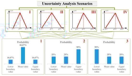 The second factor is the probability distribution of the variation expressed in terms of the probability of occurrence of the mean and boundary values. Accordingly, there are three situations analyzed in this study: the probability of concentration on the mean value; the probability of bias on the upper boundary value; and the probability of bias on the lower boundary value. In the case of probability centered on the mean, this factor implies that the uncertainties have a high stability at the mean. The other two situations imply that volatility tends to go in either pessimistic or optimistic directions. By combining the above two factors, this study develops 12 scenarios whose notations and goal values of single-objective optimization are presented in Table 8. Scenario I-1’s solution is detailed above.