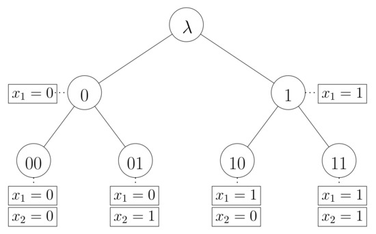 The size of the problem is given by the number of variables, n, e.g., , for the formula of Example 1. There are straightforward bijections between several sets of size : (i) candidate solutions (variable allocations) of a CNF formula with n variables, (ii) (characteristic functions for) subsets of set , (iii) branches (root-to-leaf paths) of the complete binary tree of height n. For case (iii), a tree path starting from a root can be naturally labelled as a string of bits, where bits indicates its left/right “choices” (turns) in the top-down (root-to-leaf) order.