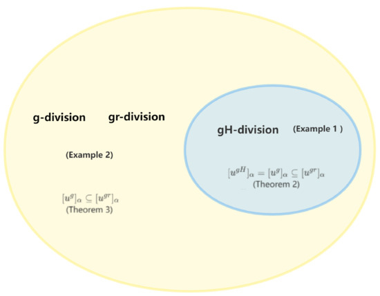 Next we clarify the relationships among the three divisions. For any , let and denote the gH-division, g-division and gr-division, respectively. The following theorems hold.