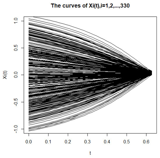 We choose casually that , the sample sizes n as , t takes 1000 equispaced values in . We carry out the simulation of the curve for the 330 samples (see Figure 1).