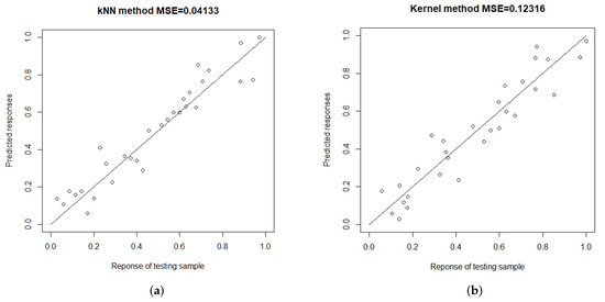 As we can see in Figure 2, the MSE of the kNN method is much smaller than that of the NW method, and the scattered points in Figure 2 are more densely distributed around the linear function , which shows that the kNN method has a better fit and higher prediction accuracy for the NA dependent functional samples.
