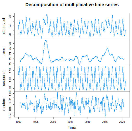 This section applies the proposed kNN regression analysis of the data, which consist of the sea level surface temperature (SST) for the El area (0–100 S, 800–900 W) for a total of 31 years from 1 January 1990 to 31 December 2020. The data are available online at the website: https://www.cpc.ncep.noaa.gov/data/indices/ (accessed on 1 January 2022). More relevant discussions of these data can be found in Ezzahrioui et al. [13,14], Delsol et al. [23], and Ferraty et al. [24] The 1618 weekly SST data from the original data were preprocessed and averaged by month to obtain 372 monthly average SST discrete data. Figure 3 displays the decomposition of the multiplicative time series of the monthly SST.