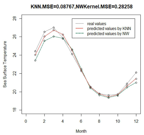 Step 4: The SST values for 12 months in 2020 are predicted by the kNN method and the NW method, respectively, along with obtaining their MSEs for both methods.