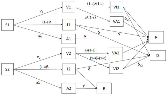 The first mathematical model developed is based on a -type epidemiological model. The model includes parameters related to the vaccine efficacy, vaccination pace and vaccine availability. The values of these parameters can be used to generate and investigate infinitely many different scenarios. Thus, we are able to approximate the situations of different places [63,69,70,101,102,103,104,105,106]. Figure 1 depicts the transits between the different subpopulations based on the disease and the vaccination status of the individuals.