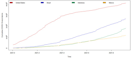 The mathematical model (1) has an advantage from an analysis point of view, since the positivity of the subpopulations is guaranteed for any time, as we will see in the next section. However, it has the disadvantage that the number of vaccinated people per unit time decreases, since the susceptible population decreases. This does not always occur in reality, since at the beginning of the vaccination programs, it is common to have limited availability of vaccines. Therefore, we propose a second mathematical model where the number of vaccines available per day is fixed. This alternative model has the same subpopulations, but the terms and are replaced by and . Thus, we achieve a constant fixed number of vaccinations per day or per unit time. From a mathematical point of view, negative values for the susceptible subpopulations and can be obtained. However, to avoid a long simulation time or period of study, negative subpopulations do not arise. In reality what happens is that some part of the population will not be vaccinated due to various reasons. For a long term simulation a more complex model that includes people that are not willing to get vaccinated and demographics is necessary. Figure 2 shows the cumulative number of vaccine doses administered in different countries. If we assume the second mathematical model, the graph should look similar to a line due to the fixed amount of vaccinations per unit time. On the other hand, if the first mathematical model is used, the graph should be similar to an exponential curve due to the fact that the number of inoculations per unit time is proportional to the number of susceptible individuals. Notice that in the case of USA, the graph can be approximated by a line or even by a quadratic, concave, downward trend, which is the opposite of what happens when the vaccination is proportional to the susceptible subpopulations. Thus, for the USA the second model might be more realistic in order to consider the vaccination program implemented.