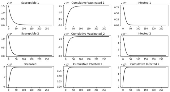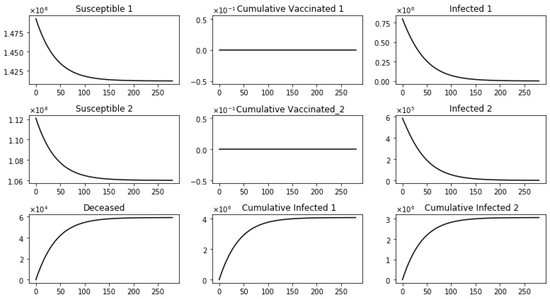 Finally, for the initial conditions we tried to replicate the conditions of the USA, but initial conditions can be changed easily [1]. Moreover, for any country for which the percentages of vaccinated and of recovered people are low, the qualitative results would be similar due to the structure of the population. In Table 1 we present the initial conditions. The initial vaccinated people was taken as zero. Thus, the initial susceptible subpopulation was given by . This can be modified to consider, for instance, that initially some part of the population is vaccinated.