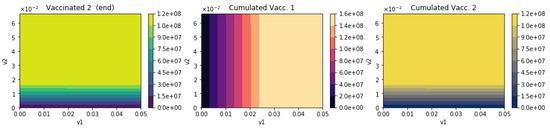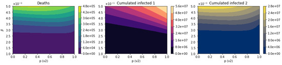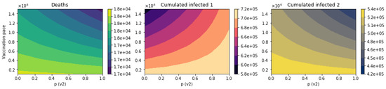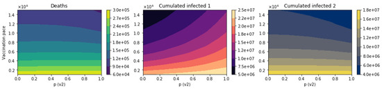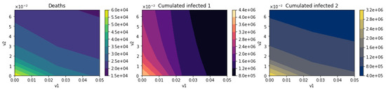 Figure 5 shows the number of deaths and infected individuals from the two different age groups. This scenario considers that the transmission rate of people in the 55+ age group is half of the transmission rate of 15–54 years-old due to the fact that older people in general take more protective measures against getting the virus. In addition, the values of the transmission rate and the proportion of vaccine devoted to each age group were varied. We considered a vaccine efficacy of 90%, a maximum constant proportional vaccination rate for age group one of and for age group two . The rate is higher for 55+ age group in order to take into consideration that there are fewer people in that age group, and therefore, a greater proportion of this subpopulation can be vaccinated under the assumption of limited vaccines. It can be seen, as expected, that increasing the proportion of vaccinated people for either age group reduces the number of deaths. Moreover, it reduces the number of infected people for each age group. If the proportion is increased, the number of infected people from age group 1 is reduced more than the number of infected people of the 55+ age group. Conversely, if the proportion is increased, the number of infected people from the 55+ age group is reduced more than the number of infected people of the 15–54 age group. These results are intuitively correct, but our aim was to find the optimal allocation of vaccines for each age group. Using a constant proportion vaccination rate does not allow one to consider a fixed amount of vaccines per unit time due to the changes in the sizes of the susceptible populations and . Despite this, Figure 5 shows that more deaths are averted when the constant proportion vaccination rate is increased. Thus, the results suggest that first allocating more vaccines to the 55+ age group is better in order to avert more deaths.