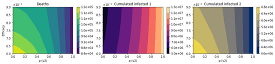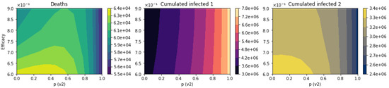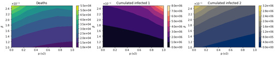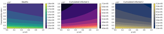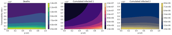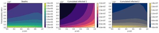The second scenario that we consider is varying the transmission rate of age group under a low SARS-CoV-2 transmission rate. Figure 9 shows the total number of deaths and the cumulative number of infected people for each age group. We can see on the y-axis the ratio of transmission rate of 15–54 age group and . Thus, the ratio means that the SARS-CoV-2 transmission rate of 55+ age group is 25% of the one of 15–54 age group. In this case the optimal strategy is to first allocate the vaccines to people in the 55+ age group. Figure 10 shows the case when the SARS-CoV-2 transmission is relatively high. In this case for a large ratio r the optimal strategy is to first vaccinate the people in 15–54 age group. This strategy is the opposite to what some countries have done. On the hand, for low ratio r the optimal strategy to avert more deaths is to allocate the vaccines to people in the 55+ age group. This is explained by the fact that under a high contagiously SARS-CoV-2 and individuals in the 55+ age group highly protected it is better to avoid infections of individuals in 15–54 age group since they are able to spread SARS-CoV-2 faster and then cause more deaths. Thus, having a highly contagious SARS-CoV-2 variant can affect which is the optimal strategy. With regard to total infected cases, the results are similar to those for total deaths.