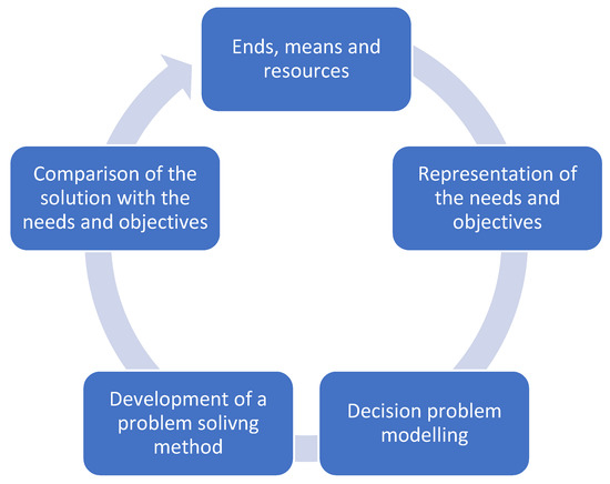 Taking into account those elements and the problem-solving cycle of Ackoff [10], discussed and extended in [24], the general methodology followed here is related to the chart below (Figure 1). It is presented as a cyclic procedure instead of the classical, iterative one [11,24].