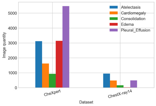 In Table 1, we can see the image quantity used for each category from different datasets. We constructed the first database of 16,372 images by combining all images available. We observed the most common disease (in the number of images) is pleural effusion, with almost 6000 images, and the least common is consolidation, with only 1086. This makes the heterogeneity of the population of images in terms of frequency (Figure 2). Thus, a sampling procedure is required to adjust that frequency to a homogeneous one.